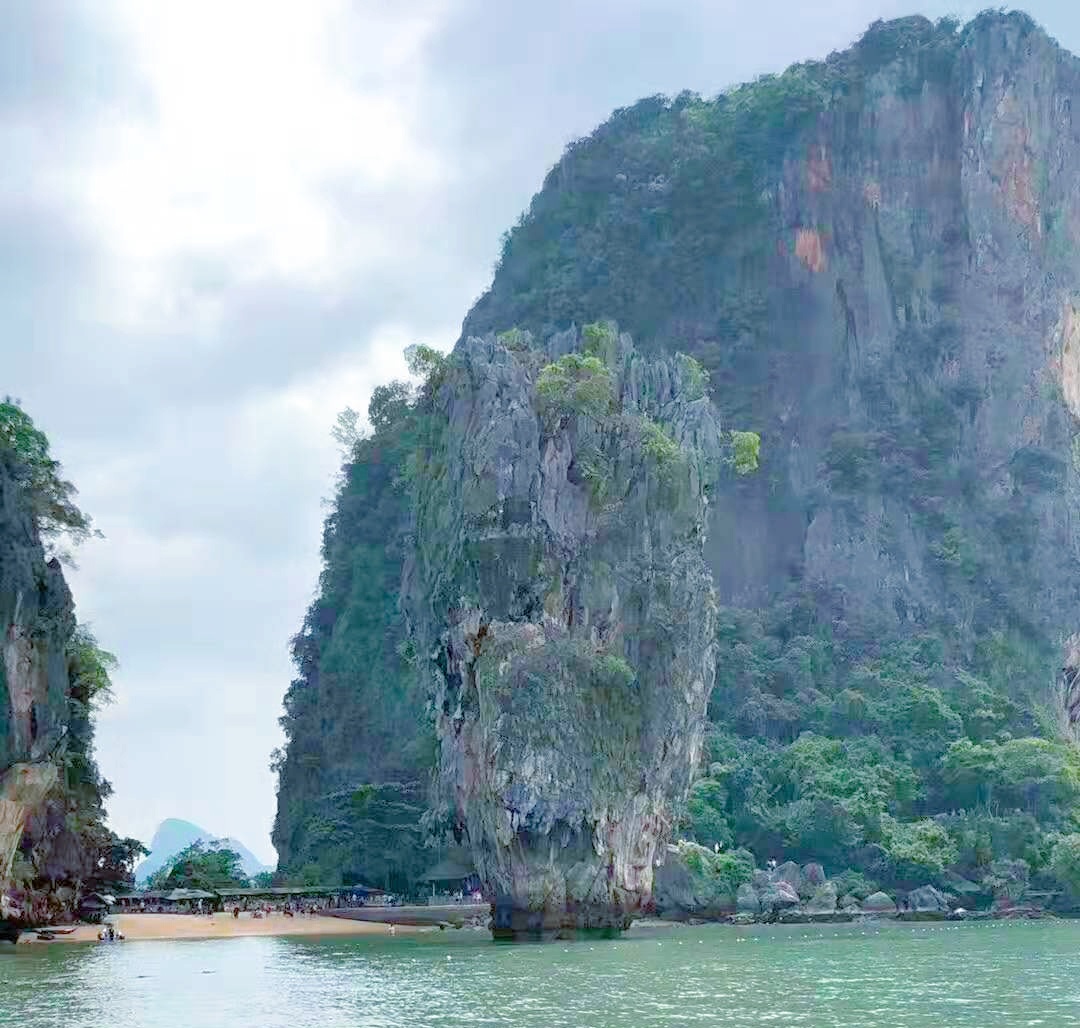 攀牙灣風景優美,呈淡綠色的海灣水面上,波光粼粼,石灰巖奇峰怪石星羅棋布,有的從水中聳起數百米。